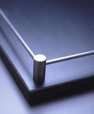 Trespa Solid Phenolic Resin board, fabricated of 1" thick black phenolic resin with black or white polypropylene pegs in 5", 6-1/2" and 8" lengths, comes with 2" to 4" deep full width stainless steel drip trough with outlet and hose. Base of pegs shall be two-prong style for mechanical attachment.