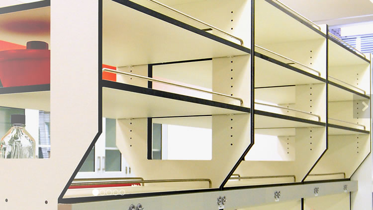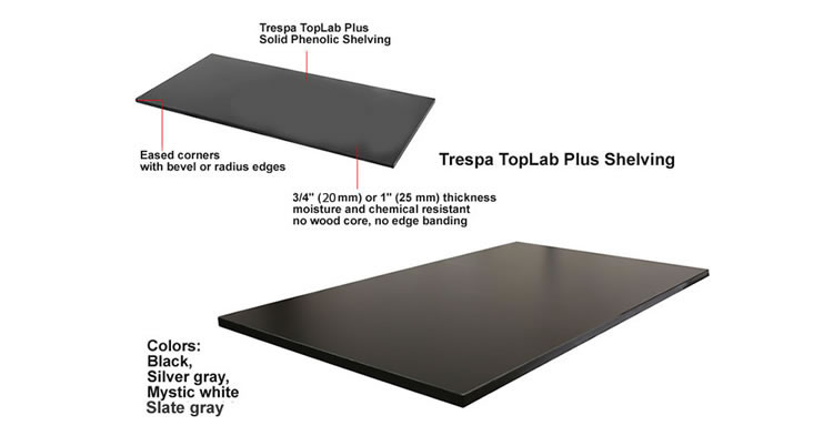 Trespa phenolic resin shelves feature excellent chemical and stain resistance. Solid composite panels require no edge banding, are not laminated, have no wood core and have excellent screw-holding capability for mechanical attachment to partition hardware or bench frames. Shelves can be easily cleaned and disinfected with a mild detergent solution.