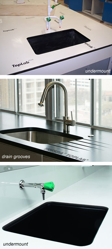 Epoxy sinks - a natural complement to Trespa TopLab Plus solid phenolic countertops and worksurfaces. Epoxy resin sinks are chemical and heat resistant, anti-microbial and do not promote the growth of bacteria. Under mount epoxy sinks require sink supports to support the weight of the sink wheras lipped drop-in epoxy sinks are applied into a recessed rabetted cutout at the countertop surface and seamed with epoxy resin adhesive to create a chemical liquid seal. ADA compliant epoxy resin sinks are also available to meet the needs of handi-capped areas of the laboratory environment.