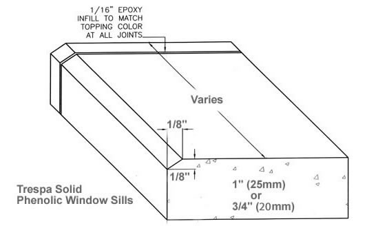 Available in a wide variety of profiles to wrap interior window frames with notch cutouts, flush to the back or side walls or overhang the sill area. All sills or stools are cut from sheet material in the colors, thickness and profiles required. Typical thickness requirements are 1" (25mm) or 3/4" (20mm).